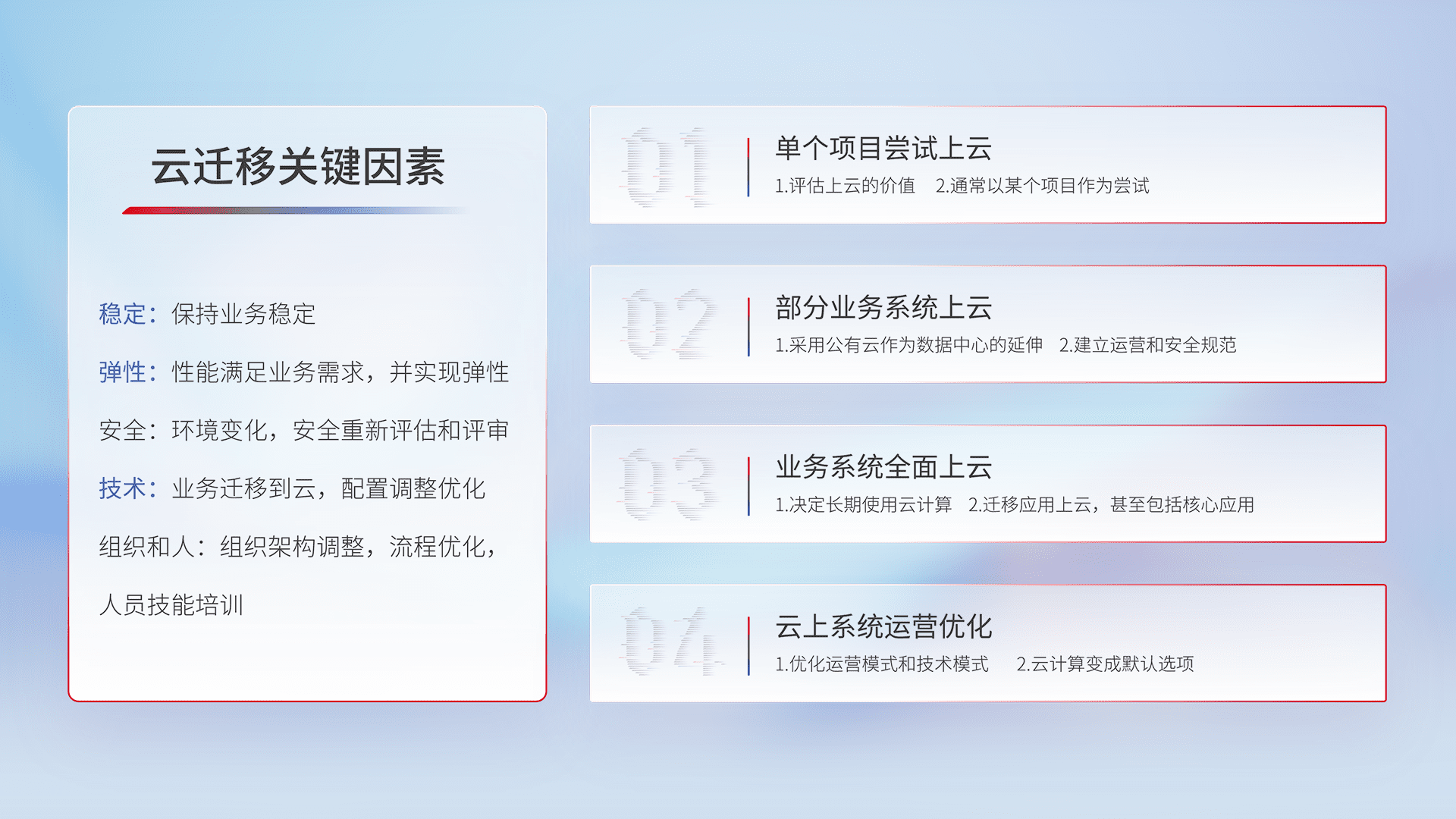 结合实际业务,,,,从规划设计、、、云平台选型、、云原生改造、、、、数据迁移、、、、集成交付,,迁移全过程为客户识别最佳上云路径,,,做好风险识别管理,,,设计网络架构、、身份权限、、、安全审计合规、、、、操作审计、、、、日志审计、、、、监控告警策略、、多站点容灾设计等,,对云上基础设施进行整体规划,,,,提升IT治理水平,,,以满足弹性、、高可用、、高性能的需求。。