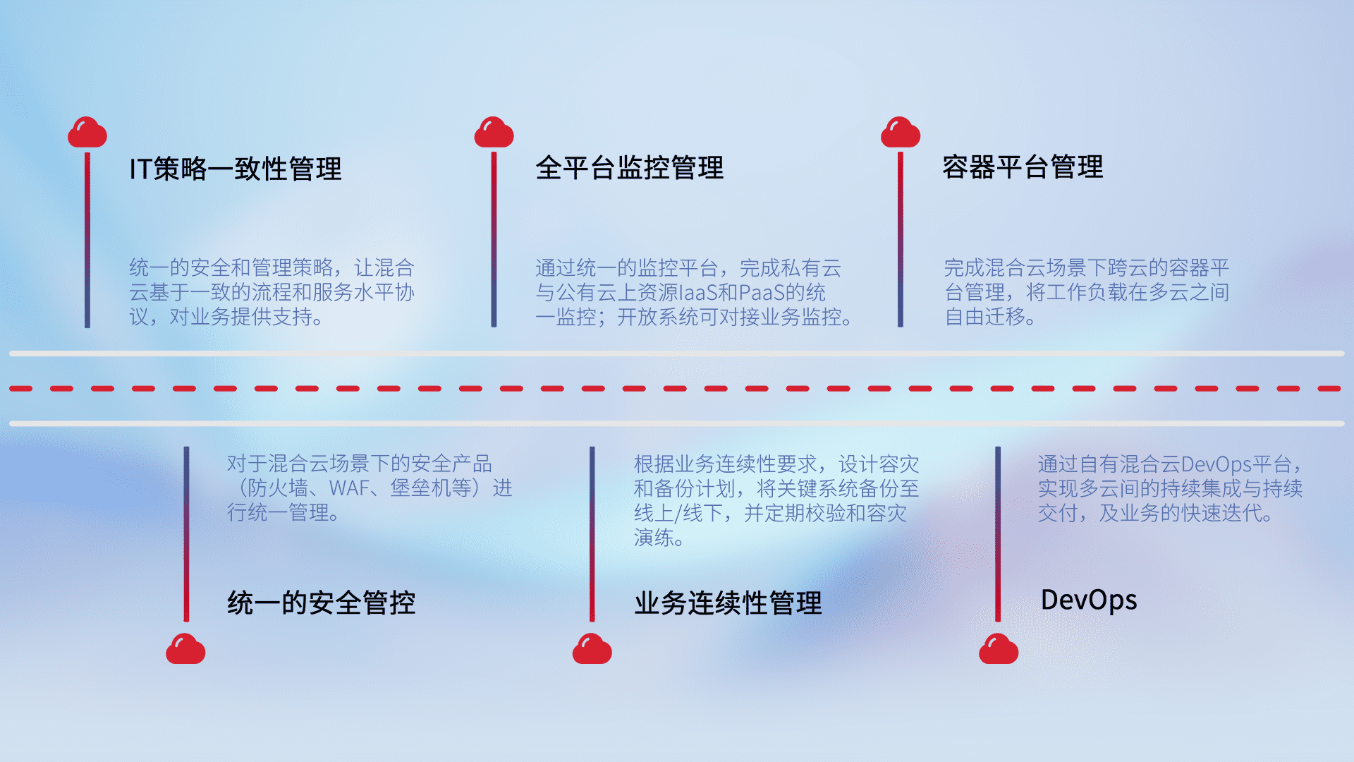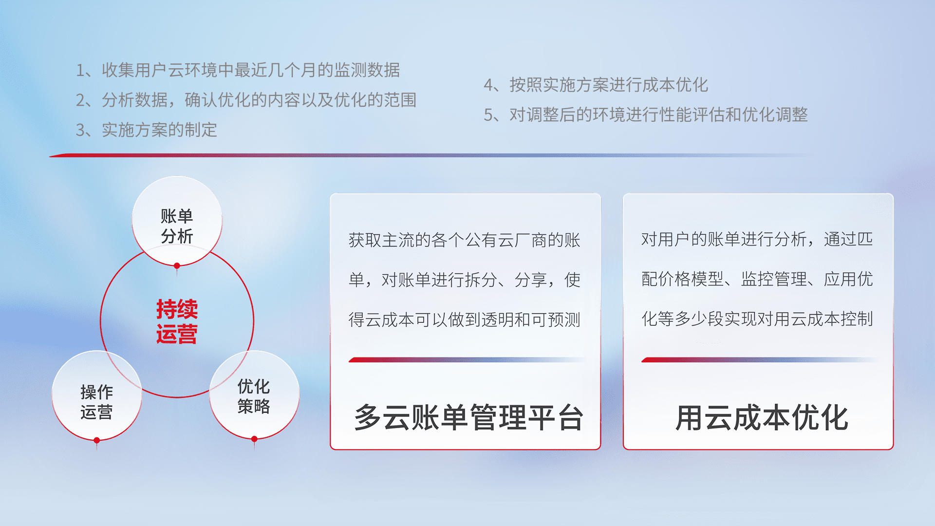 通过多云纳管,,,以统一的资源数据模型把客户的云资源进行抽象和封装,,进而实现对多云资源的统一操作,,,,保障云资源管理的可靠性、、、、稳定性与可用性。。量身定制化运维内容,,,,配置、、开发运维、、、、补丁管理、、备份、、、、监控、、、、认证和访问管理、、、、审计和日常巡检等,,,,保障在用云过程中的可靠度,,稳定度以及高可用率。。。。