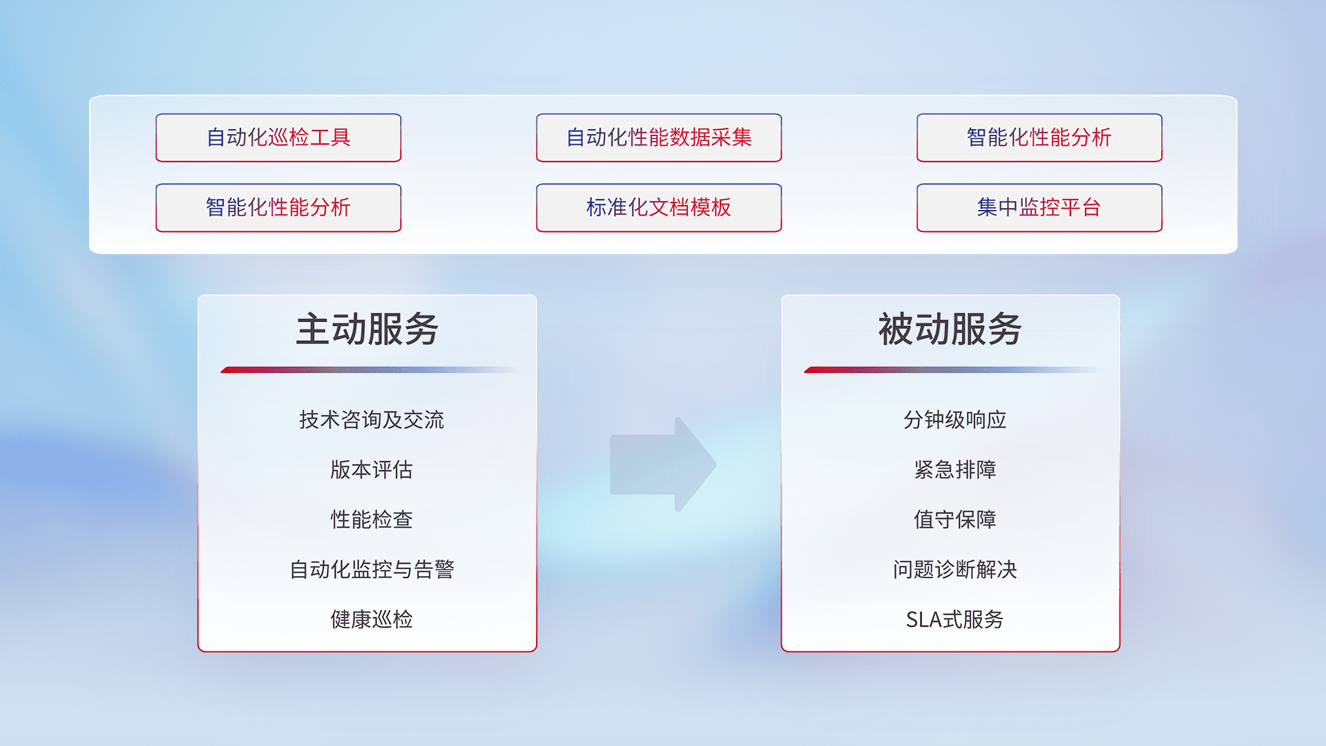 智能化工具和标准化文档,,,保障服务质量,,,提供主动服务(包含技术咨询、、版本评估、、性能检查、、自动化监控与告警、、健康巡检)和被动服务包含(分钟级响应、、紧急排障、、、值守保障、、、问题诊断解决、、SLA服务)。。。